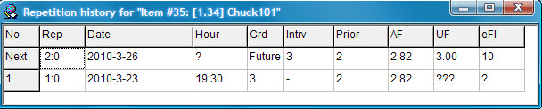 从上图可以看到,虽然今天才4月2日,但是复习的进程却将4、5月份都排满了(事实上SuperMemo给舍得排的计划一直到2011年2月27日)。这个图其实很简单,大家只要看每月的第三栏(即Reps)中即可,前一个数字就是你要复习的数量,后一个数字是你要复习的主题数量(SuperMemo里材料分为Element和Topic,不过后者用得较少)。双击相应的栏位可以进入SuperMemo的浏览器(相当于资源管理器),即可看到这一天你所要复习的具体的单词。不仅如此,如果你想要知道某个单词的复习历史的话,你可以在学习窗口按下快捷键Ctrl+Shift+H来调出该单词的复习数据,如下图: