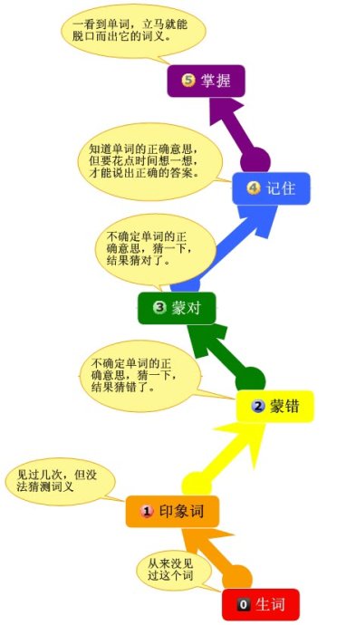 2.蒙错:不确定单词的正确意思,猜一下,结果猜错了。一看到答案时却发现:“啊,原来是这个意思,我知道的!”2、3两类的单词与其它各类词最根本的区别是,这种词你已经很熟悉(与0、1类词的区别),但无法肯定它的正确词义(与4、5类词的区别),随着猜对次数的不断增加,你对这个词的词义会由起初的“不确定”逐步过渡到“确定”,也就是说,逐步进入4、5类词的范围。