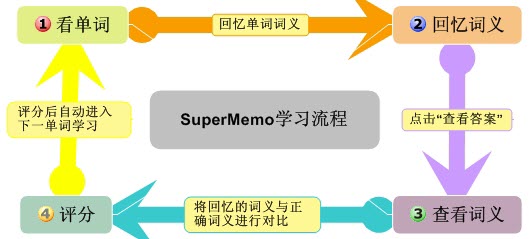 此软件的流程与SuperMemo略有不同:先显示单词=>回忆词义=>根据词义选择“记得”或“忘记”=>程序显示词义=>根据显示的词义判断“正确”或是“不正确”=>进入下一个词条的学习。