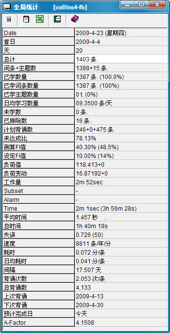 A-Factor:这个词舍得索性就不译了,系统有时也简写成“AF”,是一个相当重要的参数。它被用来测量词条的难度,AF值越高,难度就越低,反之则越高。目前我们用作例子的这个词库AF值为4.1508,这个难度是相当低了。一般3.5左右的算是难度相对合理的。