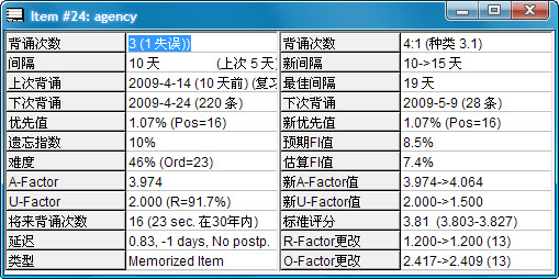 这样的详尽的数据在同类软件中是不多见的,好多软件厂家惟恐自己的算法被人掌握,竭尽所能地隐藏与算法相关的信息,但是对SuperMemo来说,这类对其他厂家来说是“秘密”的内容却大大方方地呈现在用户面前,这不得不让人佩服软件设计者的实力。因为如果不是对自己的算法有足够的自信,是绝不会公开这些数据的,否则的话,岂不是给自己的竞争对手提供攻击自己的数据吗?